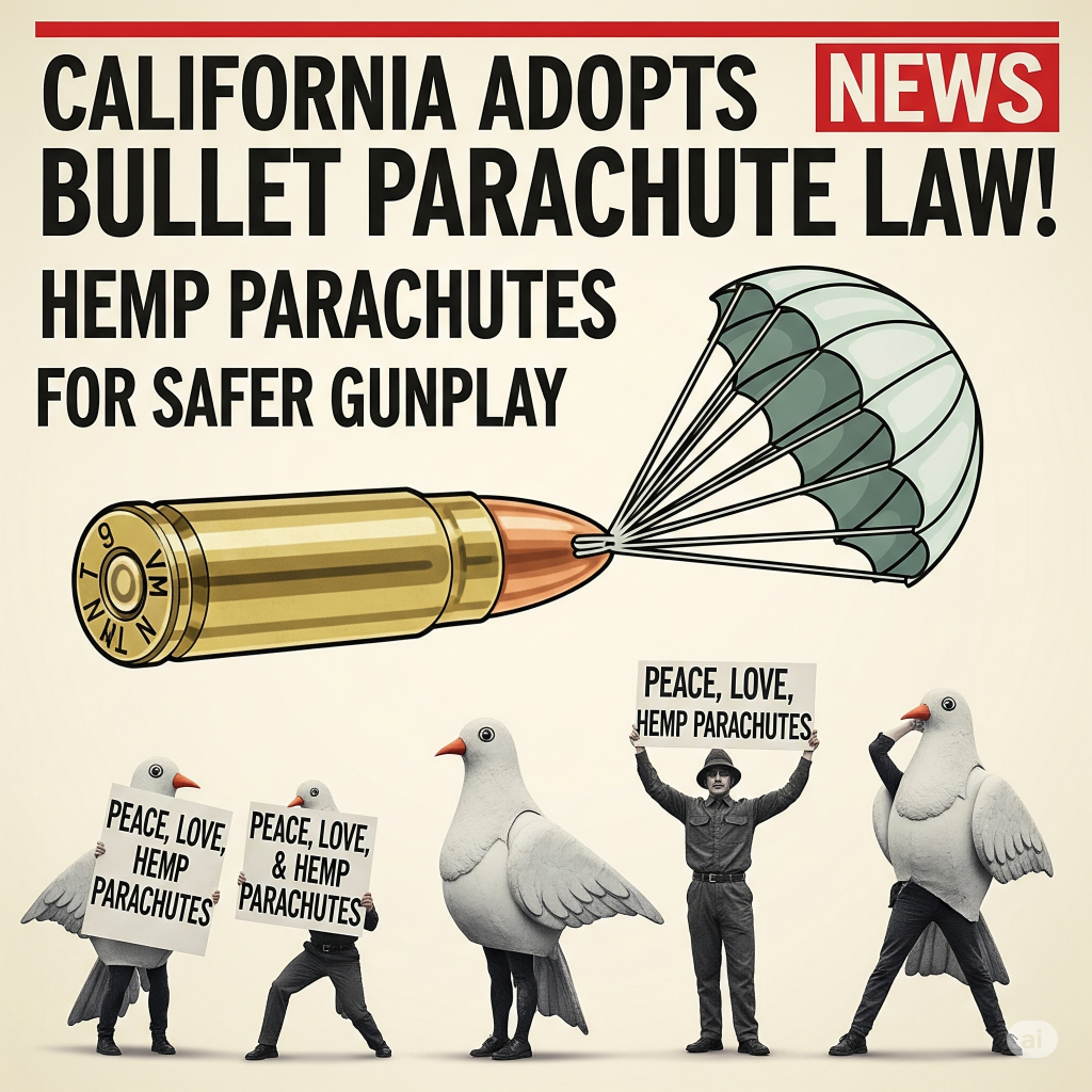 Sacramento, CA — June 10, 2025 In a bold new effort to reduce gun violence while preserving Second Amendment rights, California has passed legislation mandating that all bullets sold within the state be equipped with “government-approved mini-parachutes” to slow their velocity and make them, in the words of Governor Gavin Newsom, “kinder, gentler projectiles.” Governor […]